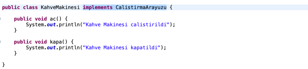 Bu durumda arac arayüzünü implement eden sınıflar hem benzinAl() hem de araciSarjEt() methodlarını da implement etmek durumunda kalacaklardır. Burada isp ihlal edilmiş olur. Bunun yerine ‘aracBenzinli’ ve ‘aracElektrikli’ isimli arayüzler tanımlanır ve sınıflar ilgili arayüzü implement eder.