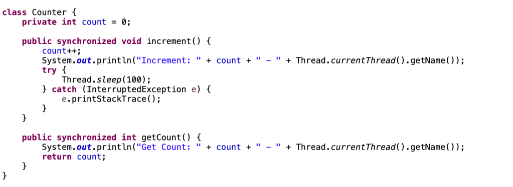 Synchronized anahtar kelimesi bir nesneyi(instance) kilitler. Bir nesnenin birden fazla synchronized methodu varsa, birden fazla thread aynı anda bu nesnenin synchronized methodlarına erişemezler. Bir thread bir synchronized method içindeyken diğer threadler diğer synchronized methodlara erişemezler. Eğer bir method synchronized değilse, nesnenin diğer synchronized methodlar tarafından kilitlenip kilitlenmediğine bakılmaksızın bu methoda erişilir.