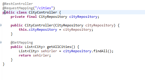 Veritabanında sehir tablosuna insert into ile 3 adet şehir ekleyelim. postman’de http://localhost:8080/cities ile bu kayıtlarımızı json formatında görelim.